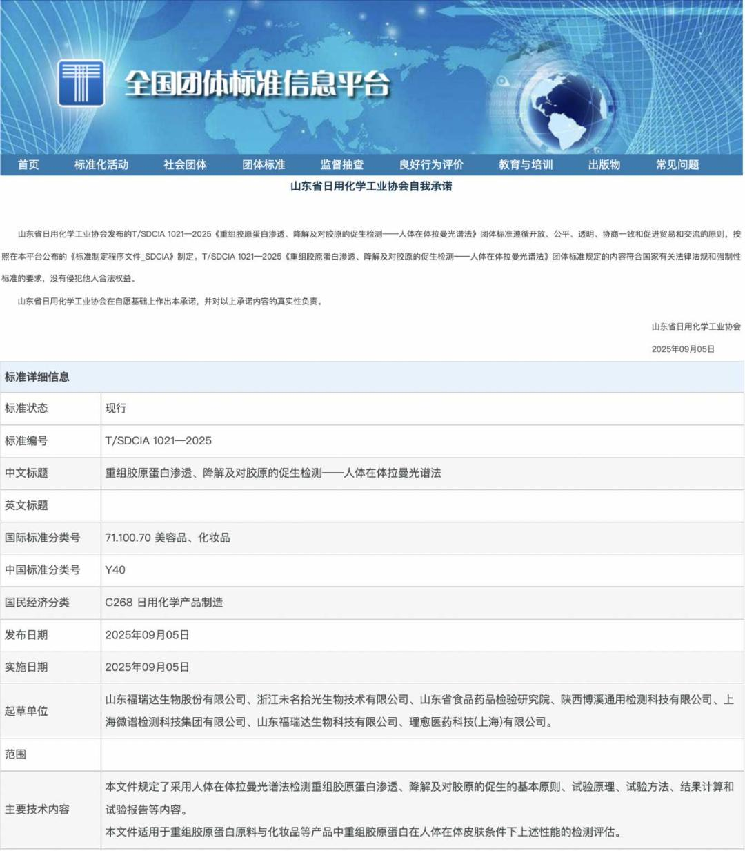 近日,由山東省日化行業協會歸口組織、山東福瑞達生物股份有限公司牽頭起草的《重組膠原蛋白滲透、降解及對膠原的促生檢測——人體在體拉曼光譜法》團體標準正式發布實施,標志著重組膠原蛋白皮膚滲透檢測有了新標準。